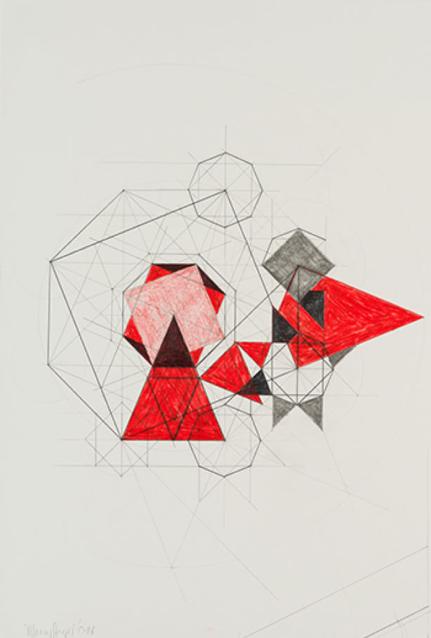 In den Bildern der in Berlin lebenden Brasilianerin Isabelle Borges formen sich Linien und Flächen zu geometrischen Räumen, konzentrieren diese oder lösen sie wieder auf. Die Flächen erscheinen als gefaltete Konstrukte, die meist in schwachnuancierten Grautönen die Schattierungen eines Realraums aufgreifen und wiedergeben. Hier findet eine Reduzierung auf das genau Notwendige statt, eine Analyse und Findung des Richtigen für den Ausstellungsraum. In den letzten Jahren hat die Künstlerin teils recht große Wandarbeiten entwickelt, in denen sie ihre Formen raumbezogen organisiert. Auch speziell für die Ausstellung im