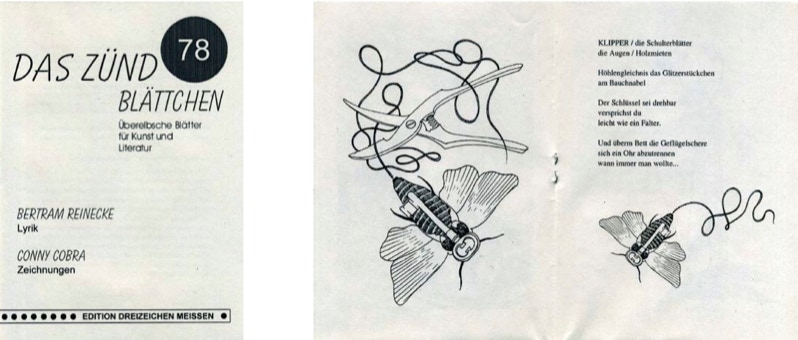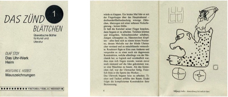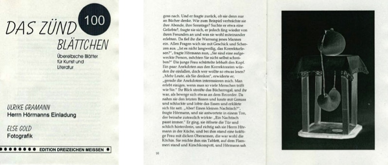 Das Zündblättchen hatte jetzt seinen Namen und erscheint nun seit Januar 2004 als Kunst- und Literaturzeitschrift im Format A6 in der Edition Dreizeichen: Die drei sind der Maler, Grafiker und Poet Wolfgang E. HerbstSilesius, die Objektkünstlerin Else Gold und anfangs auch die Verlegerin Bettina Victoria Hennig. Gedruckt wird auf einem A3-Bogen in schwarz-weiß auf Ökopapier, zuerst auf einem Risographen – einer umweltfreundlichen, japanischen Originaldruckmaschine, die kleine Auflagen ohne Ozonverpestung, Tonergift und Standby-Verschwendung zu drucken vermag. Später dann kommt ein Laserdrucker zum Einsatz. Und immer ist, wie in guten Büchern üblich, die Schriftart vermerkt, die im Zusammenspiel mit den künstlerischen Arbeiten variiert.
