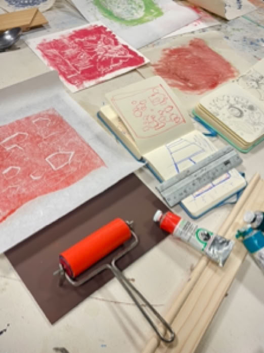 Auf dem Boden stapelten und ordneten sich verschiedene Schablonen, Farbmuster, Skizzen, Frottagen und Aquarelle, die sie auf ihren Erkundungen durch die Stadt und Landschaft der Region anfertigte und hier in neue Ordnungen und Sinnzusammenhänge brachte.